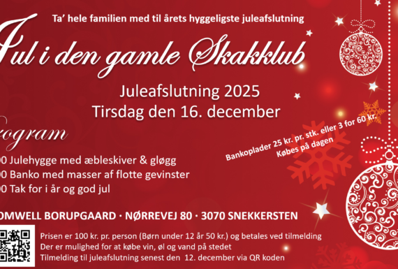 Juleafslutning – tirsdag den 16. december kl. 18.00 Vi kan næsten ikke vente med at samles til årets juleafslutning! Tirsdag den 16. december kl. 18.00 åbner vi dørene til en aften fyldt