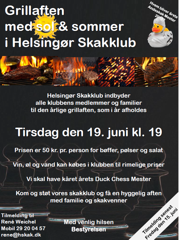 Helsingør Skakklub indbyder alle klubbens medlemmer og familier til den årlige grillaften, som i år afholdes: